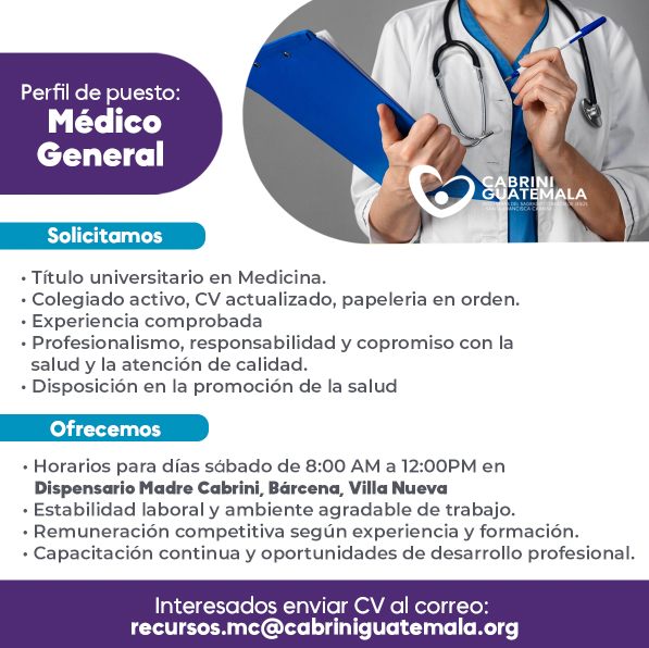 Si te interesa ser parte de equipo de Cabrini Guatemala, acá encontrarás nuestras oportunidades disponibles. Cada convocatoria indica requisitos, fechas, correo electrónico y sede de trabajo.
